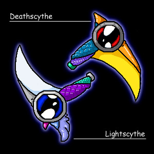 | Pictures of Deathscythe done by Me: Buqua/Direlamyl: The scythes original owners, the gods Buqua and Direlamyl. Noid: Deathscythe in his humanoid form...almost like an armor really. Scythes: Headshots of Lightscythe and Deathscythe to show differences. Avian: Deathscythe in his avian form. Pictures of Deathscythe done by others: Tim: A cute SD Deathscythe and Repteal. :3 Tim-Buqua: Tim drawing another of my characters better than me. Some say Buqua is the god of Dark magic itself and Deathscythe was his weapon.... |