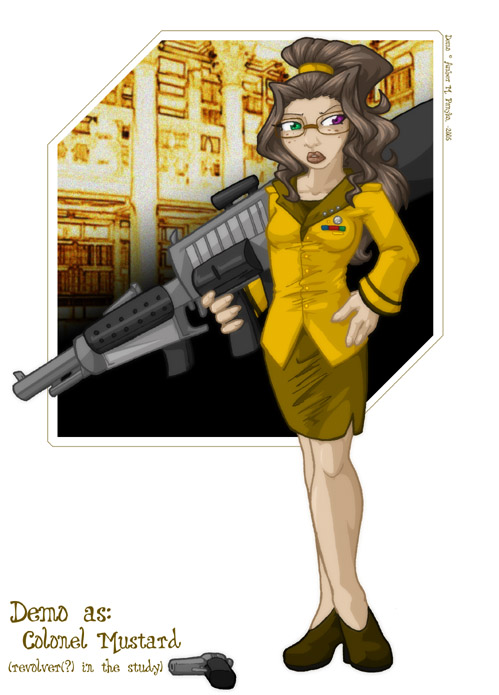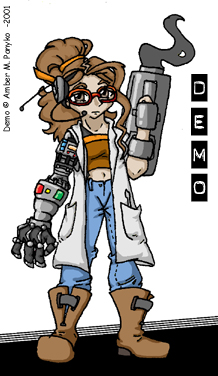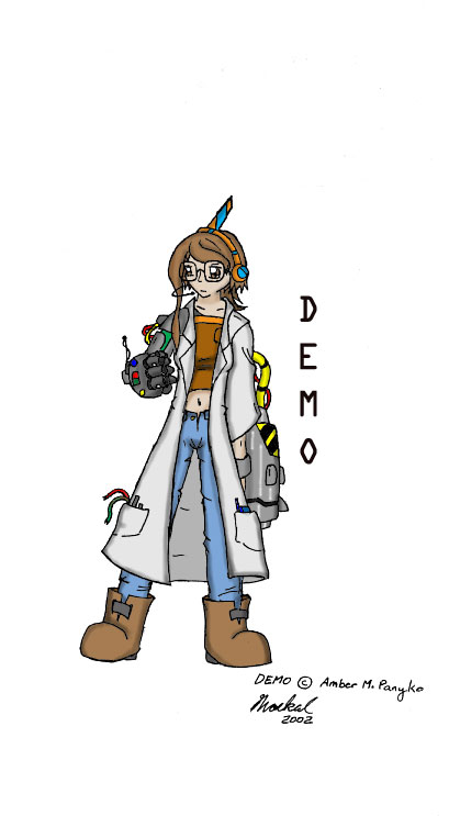 | Pictures of Demo by Me: Done in the year 2005 NEW Clue Mustard: Arachnicadian version Demo does not settle for simple revolvers. Done in the year 2004 Game: Wrong answer! WRONG ANSWER! Witchy: Acadamy Demo and Nikkle in a silly air-witch outfit. Done in the year 2003 Sketchy: Sketchy and stylized Demo showing off the cybernetic arm. Done in the year 2002 Revamp: A revamp of the Arachnicadian Demo, proving that I suck at weapons. Done in the year 2001 Old Style: One of the first prototypes for Demo, back when she had brown eyes Pictures of Demo by Others: Markal: A gift done by Markal of the Arachnicdian Demo. Wooties! |