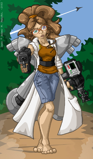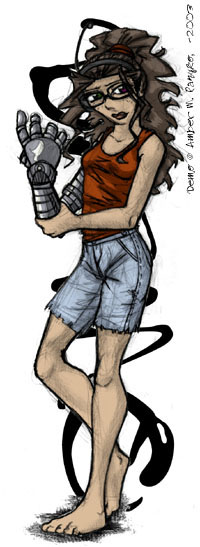 | Demona, or Demo as she is nicknamed, is a confusing character in that there are 3 versions of her in exsistance...sorta. In a universe of multiple dimensions, copies are likely to be made, and as Mikelo goes through life, he runs into three particular variations of Demo. Arachniadian: The Demo in Arachnicadia is intelligent, but also very bitter. The arachnicadians had long since ruled and Demo's parents were one of many harvested during an annual event. This event as well as others has left the Demo of the Arachnicadian dimension angry and desiring nothing more than revenge. At the time Mikelo meets her, she is 17 and one of the top mechanic/inventors of the rebel forces. A true technical genius, but also a slightly unstable one in that nothing will stop her in her quest to get back at those who took away her family. It had gone to a point in designing a cybernetic arm enchancement...but it is incredibly painful and the scars that remain on her arm remain visible. Shot-tempered and rather antisocial, Demo has few friends but those who she does warm up to end up having one of the most loyal allies at their side. Acadamy: Somewhere out there in another dimension is another Demo, one where the Arachnicadians hadn't taken over, where Demo's family is still complete and happy...and that is where the Demo who goes to the magic Acadamy resides. Along with her brother, Demo is enrolled as an air mage. It could almost be said that everything the Demo of Arachnicadia is, the Demo of the Acadamies is not. Rather shy, and not so technologically inclined, the Demo of the Acadamies is rather stuck behind the shadow of her more powerful and more popular brother, who is also enrolled. Much more sympathetic, she is often found hanging around with the less than popular groups and a little blue flying creature she calls "Nikkle" As for the third...well thats another story all together.... |