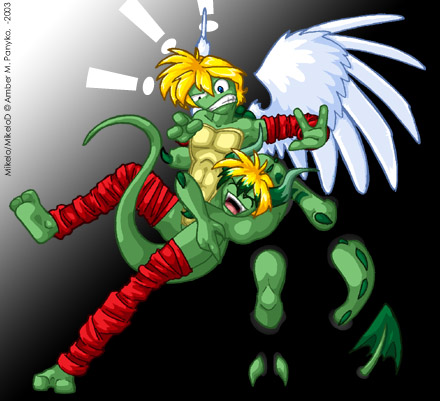 | Art by me: Done in the year 2005: NEW Obelisk: Shiny shiny shiny... Done in the year 2003: Quaint: Mikelo doesnt seem to share D's enthusiasm in many respects. Gotcha: D and his tendancy to jump out of shadows is not something Mikelo is fond of. Card: Drawn from a suggestion, Mikelo and D sharing a card. Flat colouring and all. Done in the year 2002 and earlier Meadow Contemplations: Reflections with oneself... Saturday Night: Its hard having a night on the town when you have someone that resembles you. In Darkness' Embrace: Hush.... Za?: If this is Mikelo himself in D form or D I'm unsure. My first attempt at drawing that form. Art by others: Orochi: D being...well...D-ish. Also comes in pretty monochrome colour! Yoiko: Super-cuteness strikes again! Eeee I love this pic. :3 |