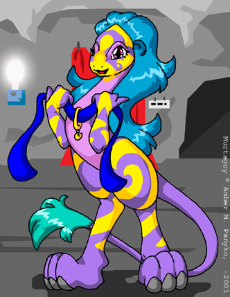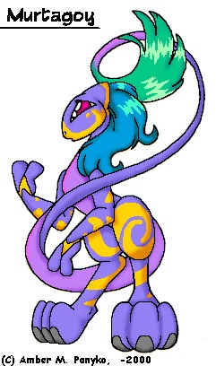 | History: When asked about her history, Murtagoy starts to talk about how she was owned by somebody and lived in someplace...but soon she'll trail off as if she has forgotten who and where it was. And odds are she likely has. What is known that Murtagoy is a varient from a genetically engineered species. The creators were an alien race who took it upon themselves to use their intelligence to create the perfect servant race, which was highly successful. Without needing to do work for themselves, the creator race delved into further pursuits of knowledge. Murtagoy's variation was a frivelous by-product to make the perfect race of "personal" servants. However shortly afterwards, the planet was overtaken by the more powerful Arachnicadian race. The Arachnicadians, a hunter species in general, chose the stronger and more hearty species of the created race over the creators, and ultimately destroyed the entire creator race in disgust over their now weakened physical state. Since then Murtagoy has been somewhat adrift...it is unknown how she ended up where she is as her particular variation is incredibly rare and highly sought after. But fate has played wierder games. Personality: It is unknown if Murtagoy's lack of foresight and intelligence is a flaw in her design, or deliberate. But the fact remains that Murtagoy is not the brightest crayon in the box. What she lacks in common sense though she makes up with heart, and Murtagoy seems convinced that it is her task to make those around her happy in any way she can. Unfortunatly in Murtagoy's mind the particular method this would best be done in is not exactly the most orthodox. As such, Murtagoy trying to push her affections onto anyone around her can be very awkward, though at the time she seems to be grasping the concept of time and place. Like a servant would, she's very obedient to those around her. Only recently has she begun to truly grasp the concept of thinking for herself. Physical Aspects: Murtagoy's peculiar colouring and shape make her ideal for shifting as she can assume the shape and form of almost any living animal. Subconciously Murtagoy seems to have a genetic library at her disposal, as she can readily assume the shape of any species and make alterations by ear. It's easy to guess that she was designed to be able to look however her owner describes. It also seems Murtagoy can expand this genetic library if she comes into touching contact with whatever she wants to transform. Though it should be noted that looks and personality are two different things. Murtagoy may be able to make herself look like someone, but acting like them requires a level of talent Murtagoy seems to lack. The nature of her shapeshifting also means she can alter her physical aspects to heal instantly, become immune to illness, or just be a downright bugger to kill. Odds are it would take total cell destruction or a swift removal of the head...but even thats debatable. Funky Fun Facts: Murtagoy's natural fragrance would be something similar to raspberries and vanilla. The particular variation of Murtagoy's kind are sterile, and the genetic coding makes her unclonable. The more common variation of Murtagoy's race are very earth-toned colours and sub-average intelligence. There are only around 3,000 of Murtagoy's particular variation in known existance. Murtagoy's default gender is female. Murtagoy has a particular love of stuffed toys, and likes to make dolls of her friends. |