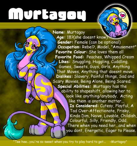 | Name: Murtagoy Age: Unknown Birthday: Unknown Gender: Female (optional) Species: Un-named Nicknames: Murty, Murts Occupation: Rebel?, Model, "Entertainment" Major(If Applicable): None Favorite Colour: All Favorite Food: Peaches Special Abilities: Shapeshifting Best Trait: Affectionate and Caring Worst Trait: A little TOO Affectionate |