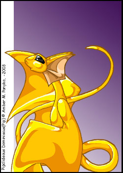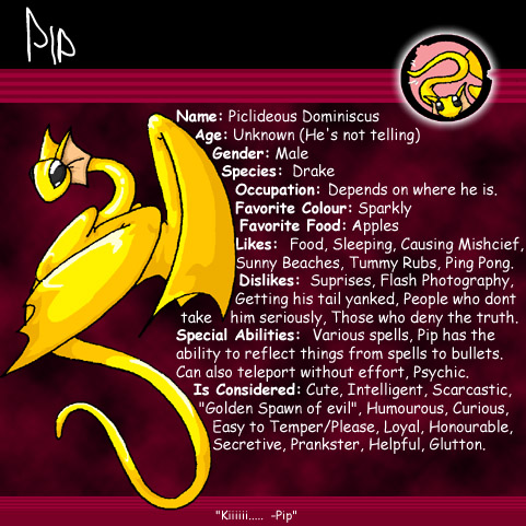 Name: Pipclideous Dominiscus Age: Not telling Gender: Male Species: Drake Nicknames: Pip, Pip-drake, Golden Hell-spawn Occupation: Varies, mostly unknown Favorite Colour: Sparkly Favorite Food: Most anything edible Likes: Tummy rubs, Sunbathing, Sleep, Food, Mischeif, Ping Pong Dislikes: Flash photography, Immaturity, Not getting his way, Rocking Chairs Special Abilities: Various, Reflection, Teleportation, Psychic Best Trait: Intelligent Worst Trait: Causes trouble easily |